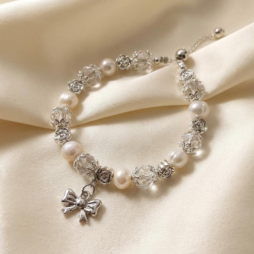 This handcrafted bracelet features a delicate combination of luminous pearls, sparkling clear crystals, and intricate silver rose spacer beads. Finished with a charming bow pendant, this piece is designed to evoke romance, elegance, and classic femininity.