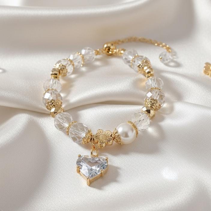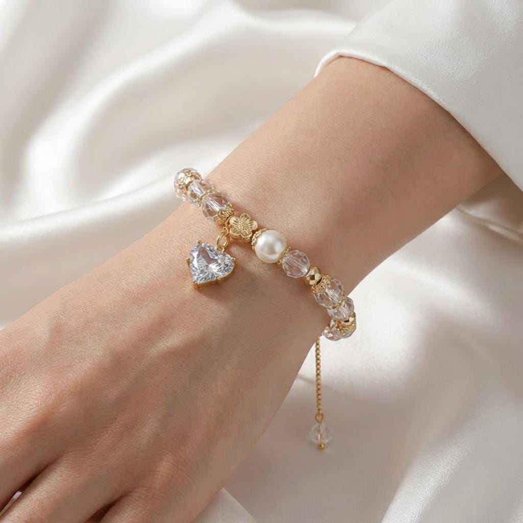 This handcrafted gold-tone bracelet features faceted clear crystal beads paired with textured gold spacer accents and a luminous pearl detail. Finished with a sparkling heart-shaped crystal charm, this piece symbolises love, elegance, and timeless femininity.