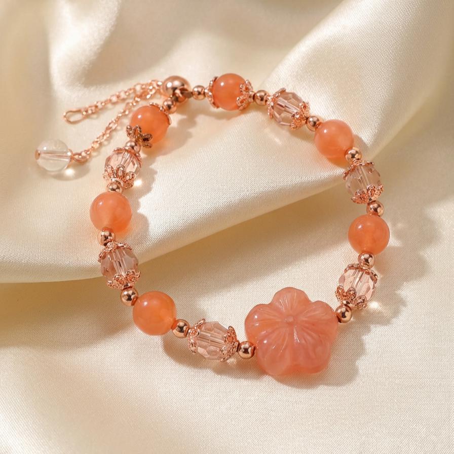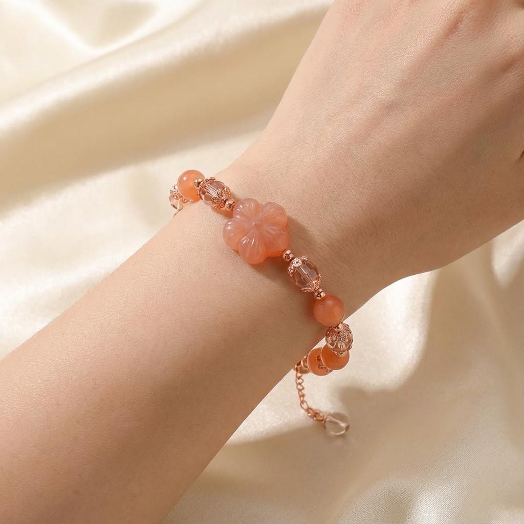 This handmade bracelet features natural Yanyuan Agate stones in warm apricot and coral shades, paired with a carved flower focal bead and rose-gold accents. The gentle color makes it an easy everyday piece that still feels special and feminine.